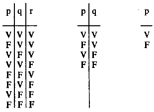 4.31 - On peut figurer les possibilités de vérité au moyen de schémas du type suivant (« V » signifie « vrai », « F » signifie « faux »; les lignes de « V » et de « F » sous la ligne de propositions élémentaires signifient, selon un symbolisme facile à comprendre, leurs possibilités de vérité) :